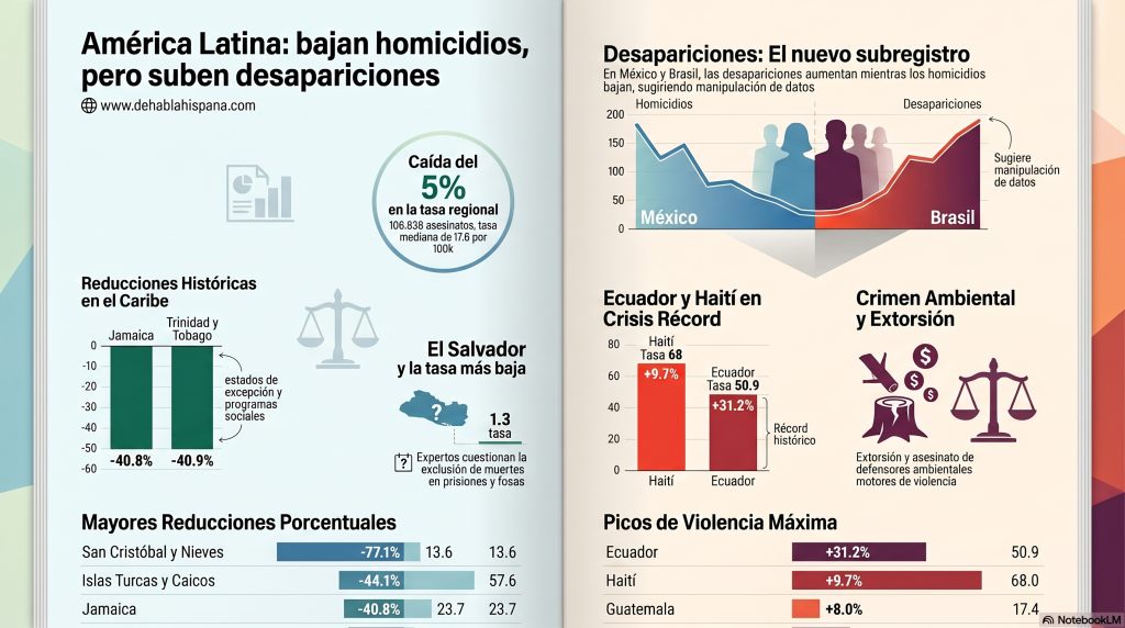 - México reportó una caída del 19.8% en los asesinatos (20,677 víctimas), pero enfrenta cuestionamientos sobre la manipulación de datos, donde las autoridades podrían estar enmascarando homicidios bajo la figura de desapariciones forzadas en estados como Sinaloa.
