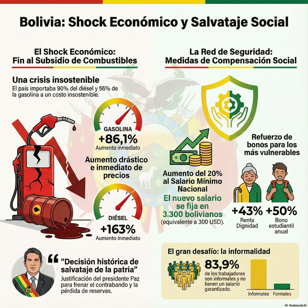 Sin embargo, analistas económicos señalan que estas compensaciones se centralizan en el sector formal de la economía. Según datos de la Organización Internacional del Trabajo (OIT), el 83,9% de los trabajadores bolivianos son informales y no cuentan con un salario garantizado. Para este segmento, la subida del diésel se traduce en mayores costos de transporte e insumos sin una red de protección equivalente.