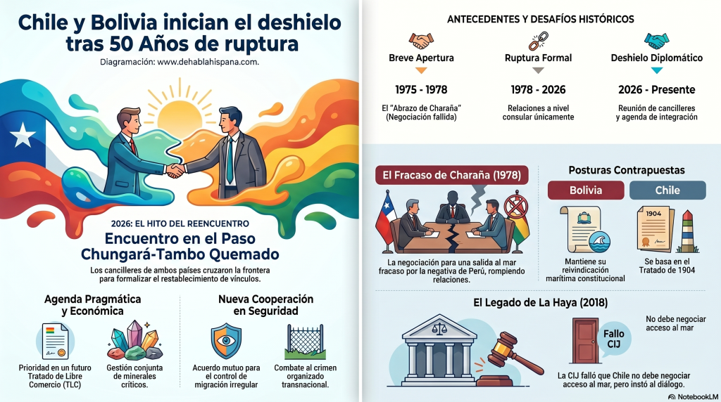 En el gélido paso fronterizo Chungará-Tambo Quemado, los cancilleres de Chile y Bolivia han marcado el inicio de un deshielo diplomático sin precedentes tras medio siglo de distanciamiento formal. Francisco Pérez Mackenna, de Chile, y Fernando Aramayo, de Bolivia, cruzaron juntos la frontera este jueves con el objetivo explícito de «restablecer» los vínculos bilaterales, los cuales se encuentran interrumpidos desde 1975 debido a la histórica imposibilidad de resolver la demanda marítima boliviana derivada de la guerra del siglo XIX.