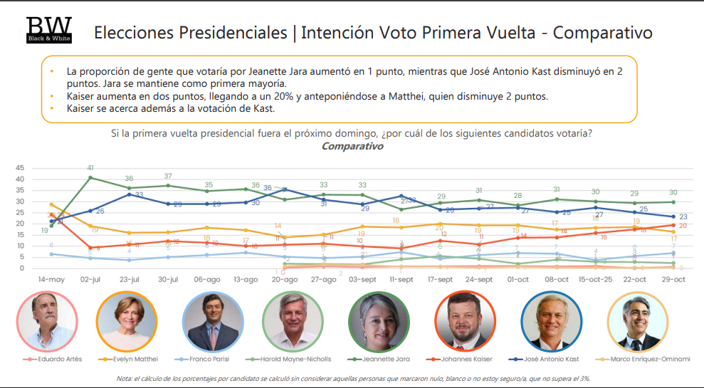 La encuesta Black&White, otorga a Jara, exministra de Trabajo del Gobierno de Gabriel Boric, un 30% de la intención de voto y a Kast un 23%, pero muy seguido de Johannes Kaiser, con un 20%. En cuarto lugar, sitúa a la representante de la derecha tradicional, Eveleyn Matthei, con un 17%.