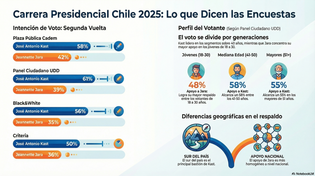 A menos de tres semanas de la segunda vuelta presidencial de Chile, los sondeos dibujan un escenario claro: José Antonio Kast se perfila como el gran favorito frente a Jeannette Jara.