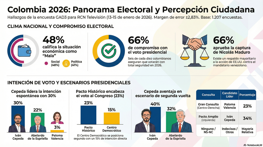 01/18/2026. Según la más reciente encuesta de Noticias RCN realizada por la firma española GAD3, el senador Iván Cepeda se consolida como el rival a batir, liderando la intención de voto espontánea con un 30 %, seguido por el abogado Abelardo de la Espriella, quien registra un 22 %.