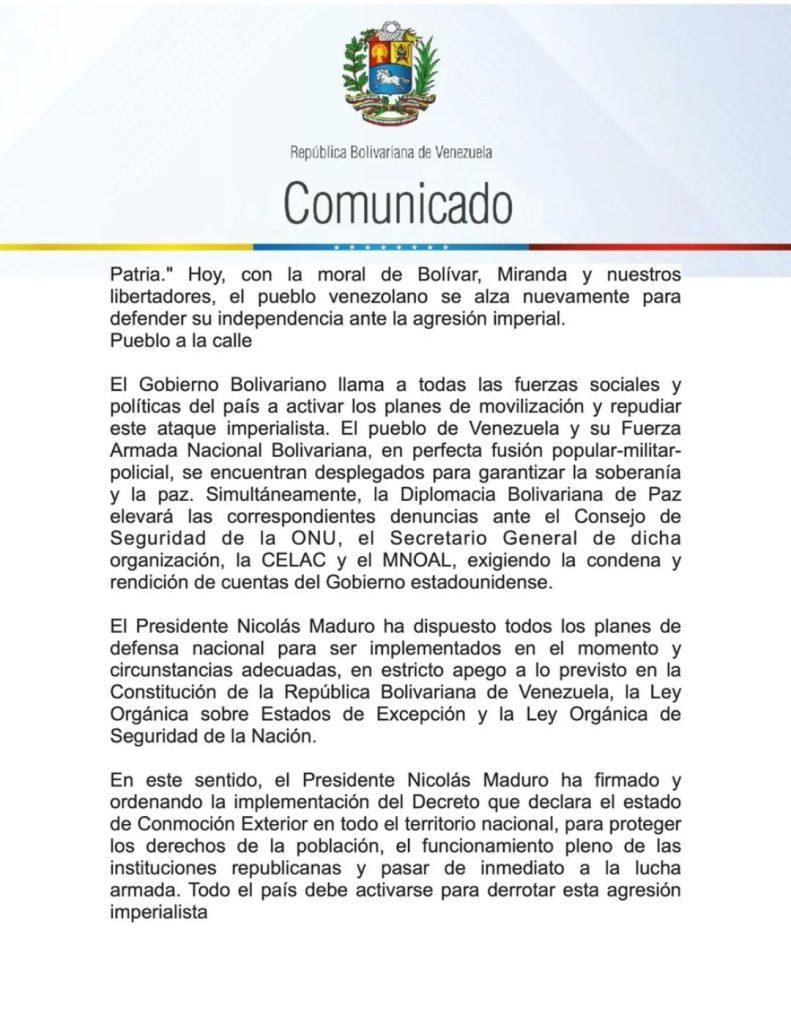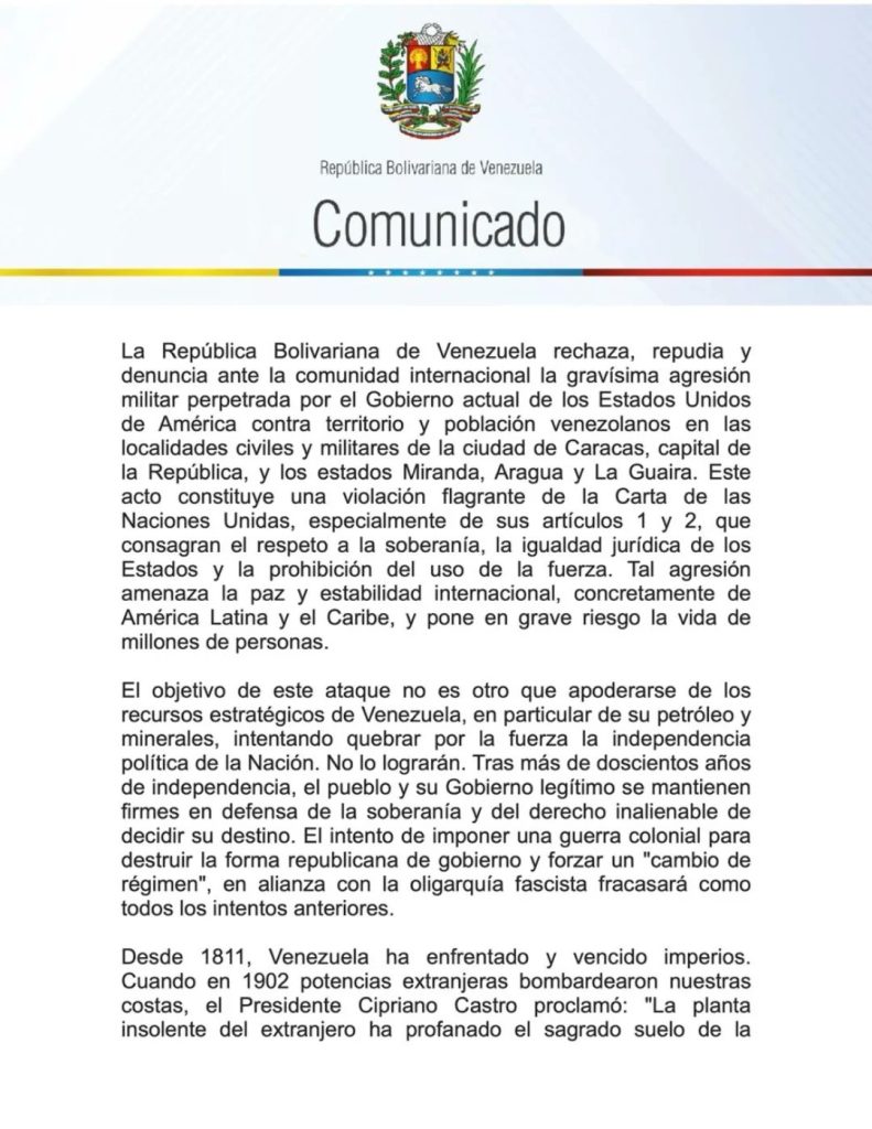 – El Gobierno de Venezuela denunció este sábado una «gravísima agresión militar» estadounidense en localidades civiles y militares de los estados de Miranda, Aragua, La Guaira y la capital del país, Caracas, y ordenó «el despligeue del comando para la defensa integral de la nación».