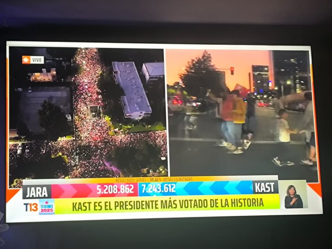 12/14/2025. José Antonio Kast se transformó hoy en el nuevo Presidente de Chile imponiéndose en las elecciones con un amplio margen, emulando al resultado del Plebiscito Constitucional de 2022 y propinando una derrota histórica a la izquierda.
