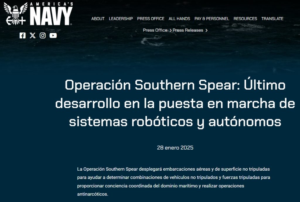 En la pagina web del departamento de defensa, publica para el 28 de enero esa operacion. Compruebelo usted en este link: Operation Southern Spear: Latest Development in Operationalizing Robotic and Autonomous Systems > United States Navy > display-pressreleases.