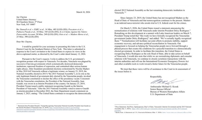 De conformidad con la solicitud del Tribunal, escribo para abordar la postura de reconocimiento del gobierno de los EE. UU. con respecto a Venezuela. Durante décadas, Venezuela estuvo plagada por sucesivos gobiernos chavistas que destruyeron sistemáticamente las instituciones democráticas, reprimieron la libertad de expresión y cometieron otros graves abusos contra los derechos humanos. Después de que las elecciones presidenciales fraudulentas orquestadas por Nicolás Maduro en mayo de 2018 dejaran a Venezuela sin un ganador legítimo, el 23 de enero de 2019, la Asamblea Nacional elegida en 2015 («la Asamblea Nacional de 2015»), en su papel como el único poder del gobierno debidamente elegido por el pueblo venezolano, invocó la constitución venezolana para declarar vacante el cargo de la presidencia. De acuerdo con la constitución venezolana, el Presidente de la Asamblea Nacional, Juan Guaidó, prestó juramento como Presidente Interino del país. El 23 de enero de 2019, el Presidente Trump emitió una declaración pública reconociendo a Guaidó como el Presidente Interino de Venezuela. Después de que la Asamblea Nacional de 2015 votara para destituir a Guaidó como presidente interino en diciembre de 2022, el Departamento de Estado emitió una declaración el 3 de enero de 2023, afirmando: «Los Estados Unidos continúan reconociendo a la Asamblea Nacional de 2015 elegida democráticamente como la última institución democrática que queda en Venezuela».