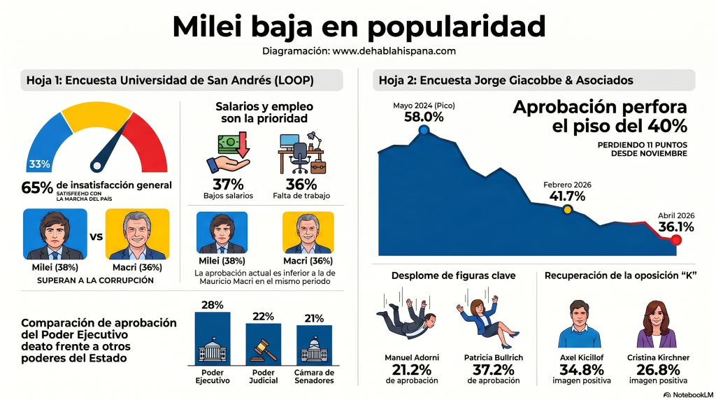 Según el último estudio de la Universidad de San Andrés, el clima social en Argentina se ha enrarecido profundamente. Actualmente, solo el 33% de los ciudadanos se siente satisfecho con la marcha general del país, lo que representa una estrepitosa caída de 7 puntos desde finales de 2025. En la vereda opuesta, la insatisfacción alcanza un contundente 65%, mientras que la desaprobación de la gestión presidencial escaló hasta el 59%.