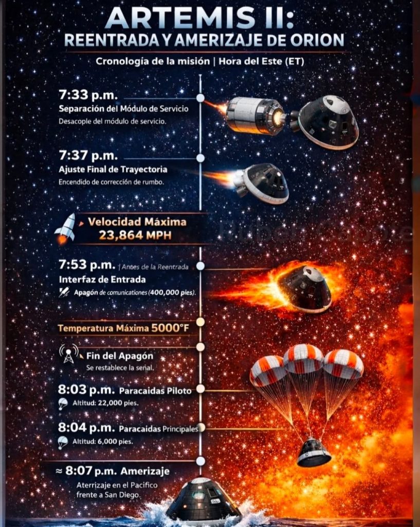 8:07 de la noche hora Miami la capsula Orión ameriza en EE.UU.
