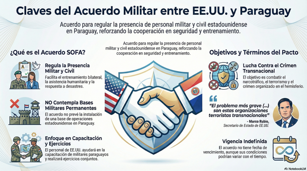 12/17/2025. A pesar de que el acuerdo SOFA permite la presencia de soldados y personal civil que puede trabajar para el Departamento de Guerra—incluso bajo mecanismos de contratos—el encargado de negocios de la embajada estadounidense en Asunción, Rob Alter, fue enfático al aclarar que no se contempla la instalación de bases militares de operaciones permanentes en el país sudamericano.