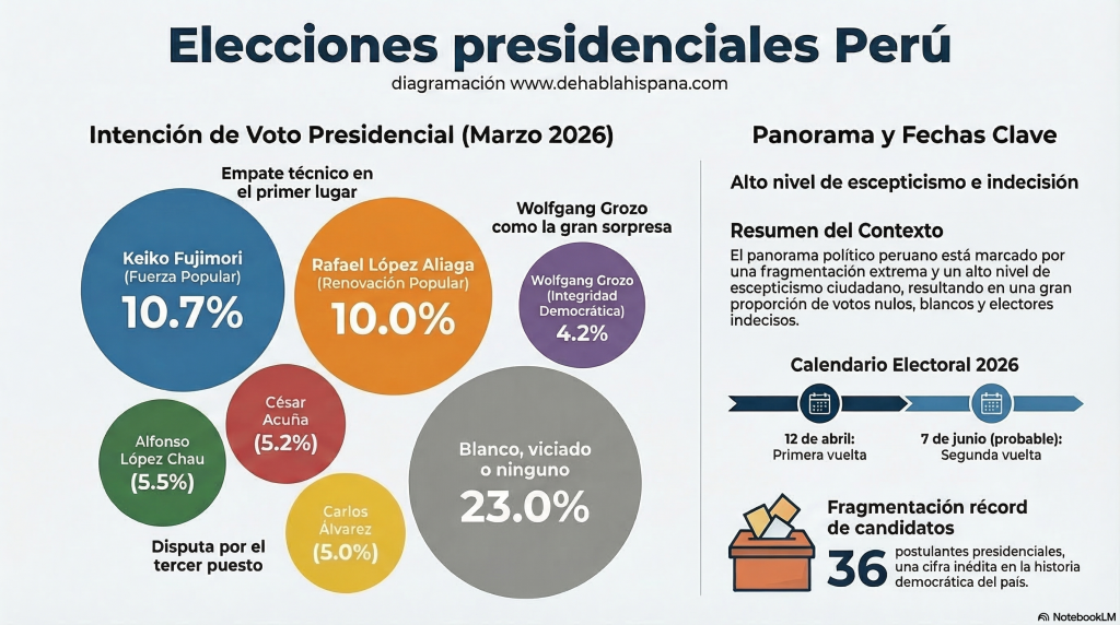 Con una cifra inédita de 36 postulantes presidenciales, el Perú se encamina a una jornada electoral el domingo 12 de abril donde no solo se elegirá al mandatario, sino también a senadores, diputados y representantes del Parlamento Andino. De mantenerse estas cifras tan atomizadas, la presidencia se definiría inevitablemente en una segunda vuelta programada para el 7 de junio. Por ahora, el 40 % de los votantes, especialmente los más jóvenes, parecen estar esperando los debates oficiales para tomar una decisión final.