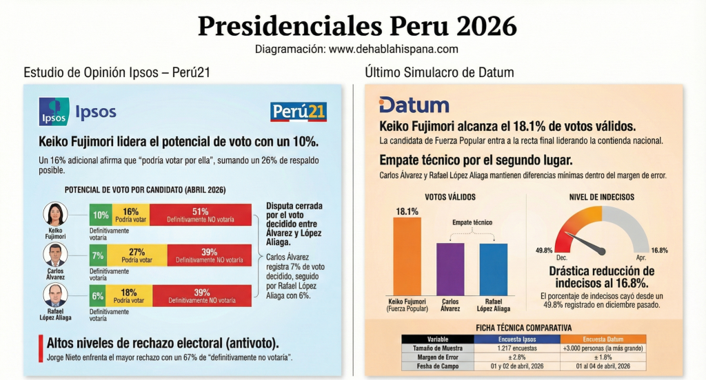 04/05/2026. Los dos estudios más recientes, realizados por Datum Internacional e Ipsos, revelan un tablero electoral fragmentado, con Keiko Fujimori sosteniendo el liderazgo, pero con una encarnizada lucha por el pase a la segunda vuelta que mantiene al país en vilo.