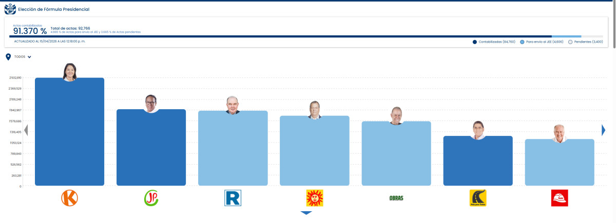 Con el 91% de actas procesadas por la Oficina Nacional de Procesos Electorales (ONPE), los resultados oficiales de las Elecciones Generales 2026 colocan a Keiko Fujimori en el primer lugar con 17%, seguida por Roberto Sánchez con 12% y Rafael López Aliaga con 11,86%. Jorge Nieto está en el cuarto lugar.