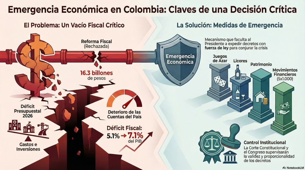 Al archivarse la reforma fiscal en el Legislativo el pasado 9 de diciembre, el Gobierno quedó ante un dilema: realizar un recorte masivo al gasto público o buscar una vía jurídica extraordinaria para obtener los recursos. La elección fue la emergencia económica, amparada en el artículo 215 de la Constitución, que permite actuar cuando hechos extraordinarios perturban de manera grave el orden económico o social.