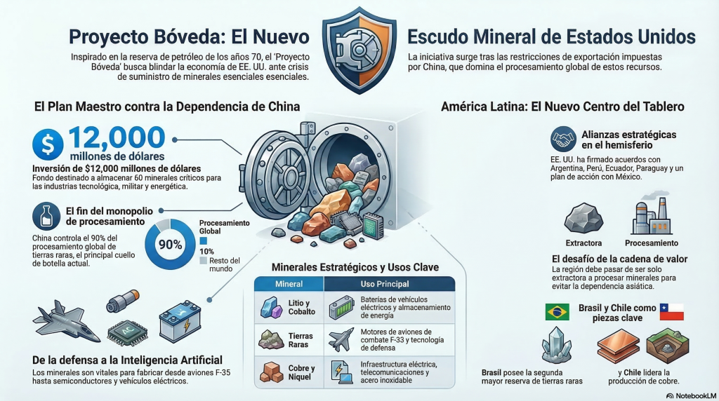 Washington ha puesto en marcha una nueva «caja fuerte» estratégica, pero esta vez no se trata de lingotes de oro ni de barriles de crudo. Bajo el nombre de Proyecto Bóveda (Project Vault), el gobierno de Estados Unidos ha lanzado una ofensiva de 12.000 millones de dólares para crear una reserva masiva de minerales críticos, situando a América Latina en el epicentro de una nueva disputa geopolítica.