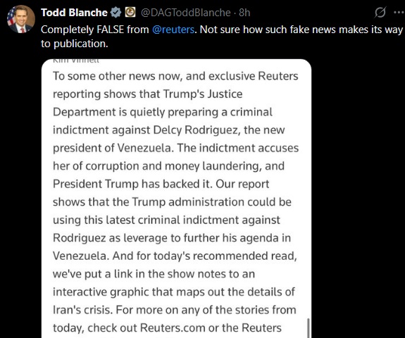 Sin embargo, la respuesta oficial fue fulminante. Todd Blanche, fiscal general adjunto de los Estados Unidos, calificó la información como “completamente falsa” a través de su cuenta en la red social X. “No entiendo cómo se publican estas noticias falsas”, sentenció Blanche, desmantelando la premisa central del reporte. A pesar de esta descalificación directa por parte de la máxima autoridad involucrada, Reuters emitió un comunicado reafirmando su postura: “Mantenemos nuestra información de que el Departamento de Justicia está preparando una acusación contra Delcy Rodríguez”.