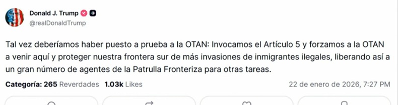 01/22/2026. «Tal vez deberíamos poner a prueba a la OTAN: invocar el Artículo 5 y obligar a la OTAN a venir aquí y proteger nuestra frontera sur de más invasiones de inmigrantes irregulares’, escribió el mandatario en redes sociales. La OTAN es una alianza militar internacional que se rige por Tratado de Washington, el cual fue firmado el 4 de abril de 1949.