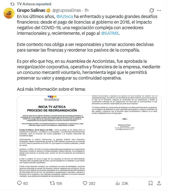 Este 26 de febrero, TV Azteca, la empresa propiedad de Ricardo Salinas Pliego, anunció que iniciará un proceso legal conocido como «concurso mercantil voluntario». Aunque el término puede sonar alarmante, en realidad se trata de una herramienta que le permitirá reorganizar sus finanzas y deudas bajo la supervisión de un juez.