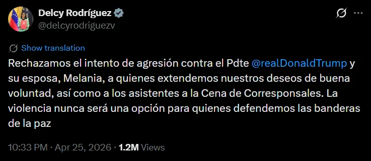 04/26/2026. Sin embargo, lo que para algunos es un gesto de «diplomacia de paz», para otros representa una omisión histórica y una contradicción ética difícil de digerir. Mientras Rodríguez utiliza las plataformas oficiales para rechazar la violencia en suelo estadounidense, el silencio sobre los eventos ocurridos durante la extracción de Nicolás Maduro sigue siendo absoluto.