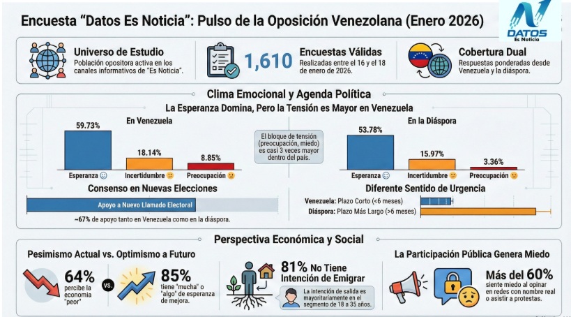 El más reciente informe de la prestigiosa empresa «Datos Es Noticia» de enero de 2026 revela una transformación profunda en las expectativas de la población opositora en Venezuela. A pesar de los desafíos persistentes, el estudio evidencia un fenómeno de «pesimismo retrospectivo con optimismo prospectivo», donde la esperanza se ha consolidado como el motor emocional dominante tanto dentro como fuera del país.